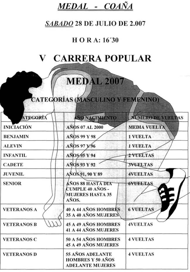 La Sociedad Deportiva de Medal organizadora del V Cross Popular Medal-2007 que se celebrará el próximo día 28 de Julio actual a las 16,30 horas sobre un circuito urbano de nuestro pueblo, tenemos el gusto de invitarles a participar en la citada prueba deportiva la cual constará de categorías tanto masculina como femenina y en categorías acorde con el reglamento de la Federación de Atletismo, adjunto se les manda programa de las mismas para su conocimiento.